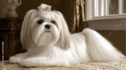 Adorable white lhasa apso dog relaxing on luxurious sofa