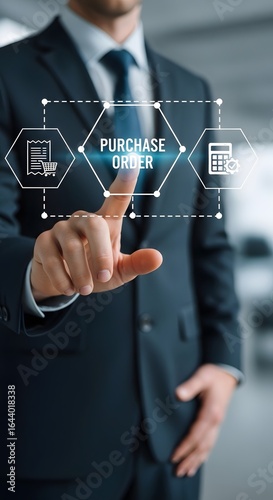 Professional businessman interacts with digital interface for purchase order management, symbolizing efficiency and modern commerce