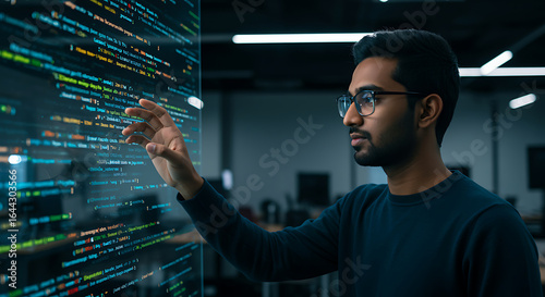 A focused indian software developer in glasses interacts with a futuristic transparent display showing complex code, immersed in the world of technology and innovation