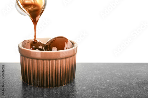 Pouring caramel sauce onto chocolate ice cream in bowl against white background