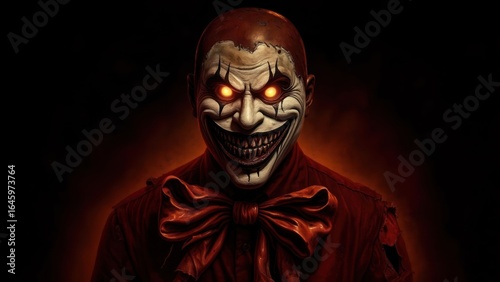 Terrifying Clown with Glowing Eyes and Menacing Grin in Dramatic Lighting
