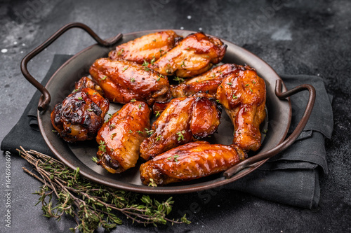 Savory grilled chicken wings smothered in tangy barbecue sauce, the ultimate treat for meat lovers and party enthusiasts. black background. top view