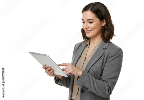 A confident young professional woman in smart-casual attire subtly smiling, interacting with a digital tablet on a bright white studio background, concept of modern digital proficiency and