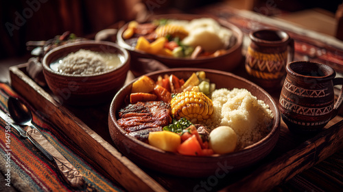 Typowo peruwiańska uczta z tradycyjnymi potrawami podanymi w autentyczny sposób, ukazująca kulturę i smaki Peru.