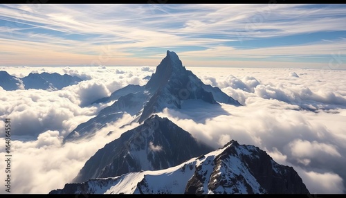 Eiger, Mönch, Jungfrau peaks dramatically rise above a swirling sea of clouds, viewed from Mürren-Birg terrace, clouds, aerial view