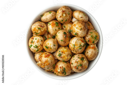 Bowl of sauteed mushrooms with herbs, delicious appetizer, gourmet food photography, culinary art, isolated on transparent background