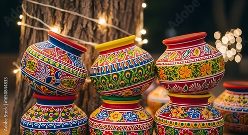A vibrant collection of traditionally hand-painted clay pots stacked outdoors by a tree with festive lights.