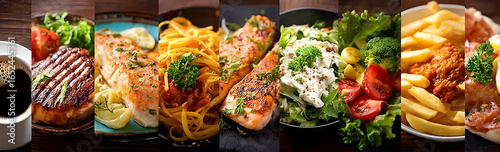 A vibrant display of various delicious meals, including grilled salmon, pasta, fresh salad, and crispy fries. Perfect for food photography enthusiasts.