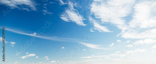 A serene view of the sky filled with white cirrus clouds against a vivid blue backdrop.