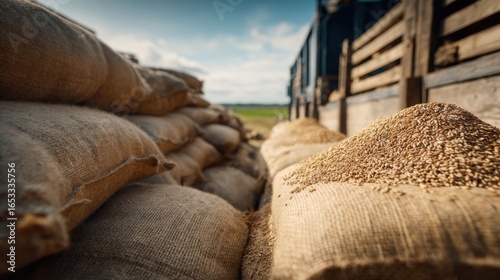 Praca na farmie z zebranym zbożem w tle o poranku w świetle wschodzącego słońca