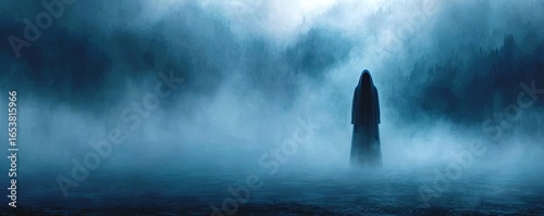Ghost howl through the crystal raven concept. A serene landscape shrouded in mist and mysterious shadows.
