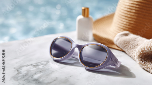 Elegant summer still life by the pool. Features sunglasses, sunscreen, a hat, and towel. Ideal for travel, vacation, or relaxation concepts. Beautiful light and composition.