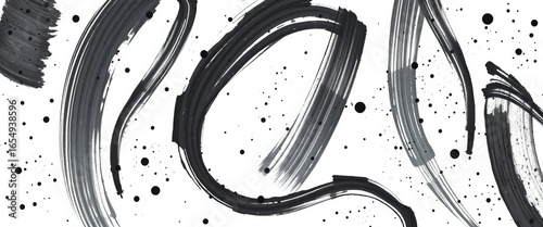 Abstract black ink brush strokes, splatters, and textures on white background, brush, expressive