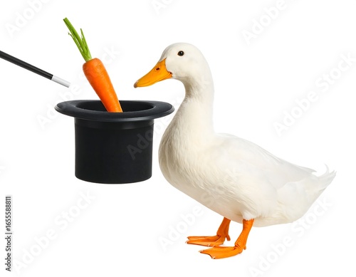 White duck beside a top hat, a carrot appearing magically from it with a wand