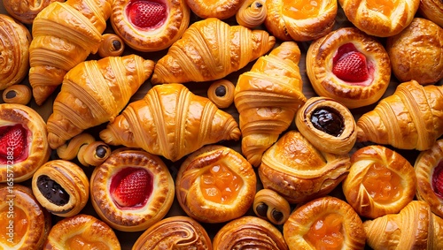 Overhead view of a vibrant assortment of golden glazed croissants, fruit tarts, and sweet danishes