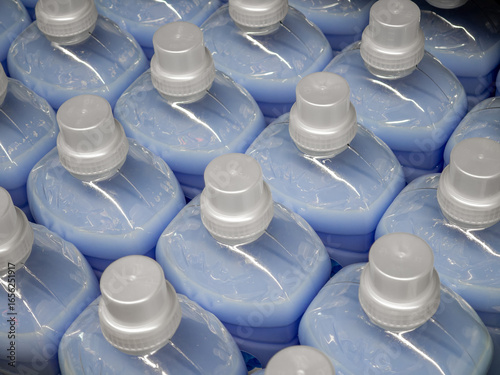 Colorful bottles with screw caps with fabric softener, detergent, household chemicals background