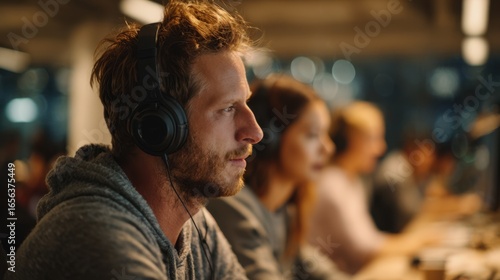 Medium shot of enthusiastic coder wearing headphones concentrating on civic tech software development rest of team and room softly blurred.