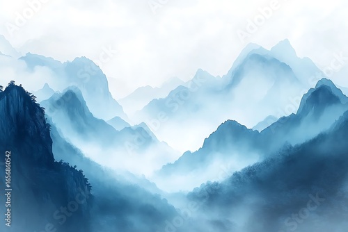 Misty blue watercolor mountains shrouded in ethereal fog creating a serene and atmospheric landscape scene