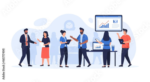 Diverse business team collaborates in an office meeting, analyzing data and charts for strategic planning and growth. Ideal for corporate concepts.