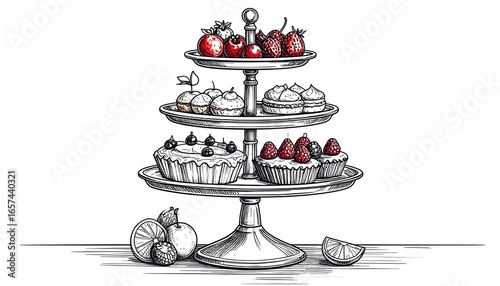 Three-tiered cake stand laden with assorted pastries and fresh berries