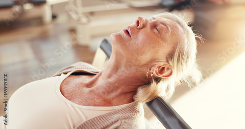 Break, pilates and reformer with mature woman in studio for exhaustion, fatigue or recovery. Exercise, fitness and rest with tired old person in health class for training, wellness or workout