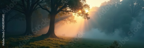 Sunbeams pierce dense fog, illuminating ancient trees , fairytale, depth, shadows
