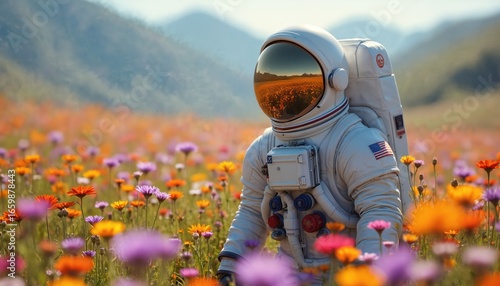 Astronaut in field with orange flowers reflecting in helmet. Cosmonaut among colorful wildflowers with meadow and mountains. Space traveler explores idyllic planet. USA flag on spacesuit.