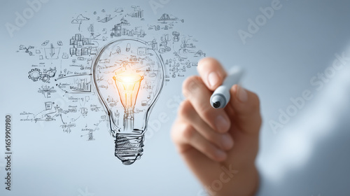 Light bulb symbolizing creativity and innovation, with sketches of ideas and concepts surrounding it, representing inspiration and brainstorming in modern workspace