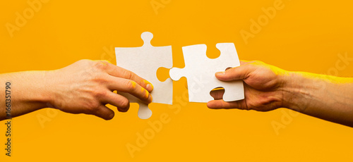 Hands connecting puzzle pieces. Male and female hand joining two matching puzzle pieces together in a conceptual image of teamwork and cooperation