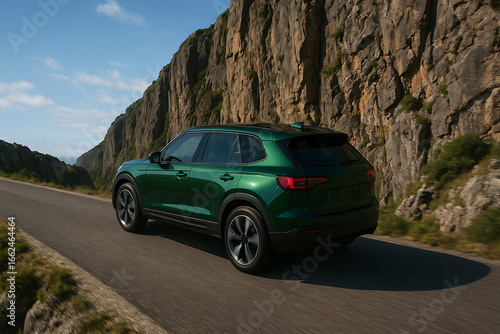 青空と岩肌を背景に緑のSUVが峠道を走り抜ける迫力描写