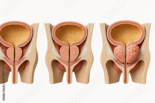 Comparative 3D render of male pelvis cutaway models: normal smooth prostate with open urethra, moderate enlargement narrowing lumen, severe nodular mass compressing urethra with thickened bladder wall