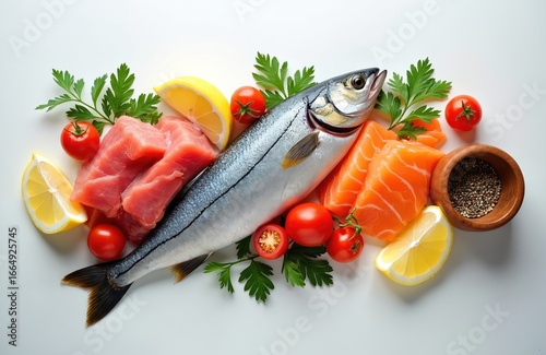 Fresh seafood arrangement with fish, vegetables, herbs. Salmon, tuna slices on plate. Tomatoes, lemons, parsley, thyme add flavor, nutrition. Healthy protein sources for cooking, recipe ideas.