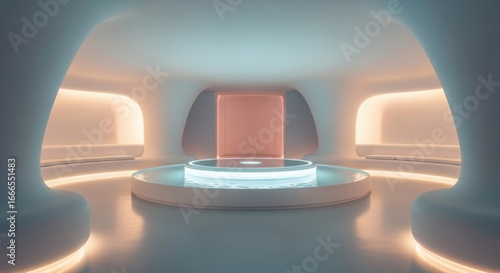 Futuristic futuristic interior design with glowing pod and futuristic seating