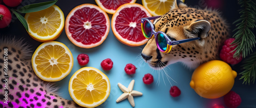 fond bleu agrumes (pamplemousse, orange et citron) décoré de framboises, d'une étoile de mer entouré par un guépard à lunettes cool, style flat lay, vu de dessus, style suréaliste