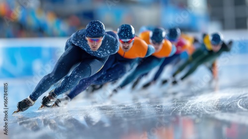 Speed skaters engage energetically on a shiny ice rink in a high-speed race, embodying the dynamic intensity of ice sports. It represents the idea of athletic contests and winter sports.