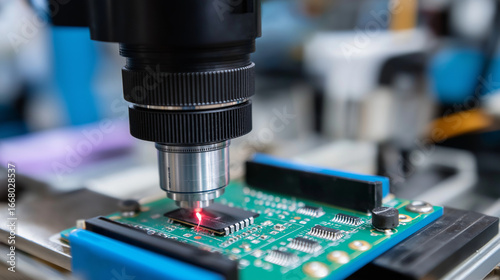 An automated optical inspection (AOI) system detects microscopic defects in manufactured electronic components. A high-resolution camera scans a circuit board, and a screen shows