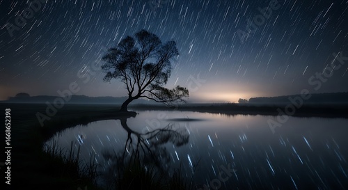A lone tree stands by a still pond under a night sky filled with star trails.