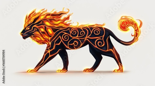 A fierce artistic portrayal of a lion with flames and tribal patterns exuding strength and creativity.