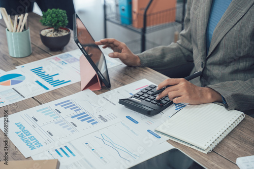 Auditor and accountant team working in office, analyze financial data and accounting record with calculator. Accounting company provide finance and taxation planning for profitable cash flow. Insight