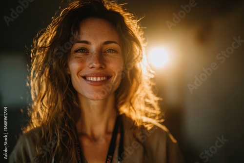 Grinning Woman in Sunlight with Curly Hair and Freckles