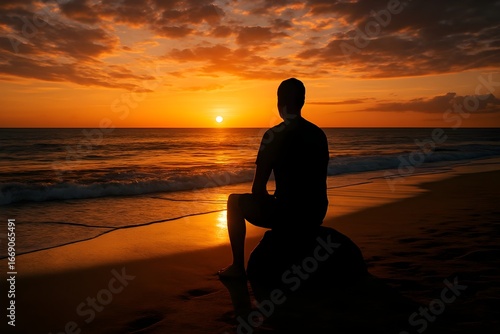 A striking silhouette of a person sitting on a rock by the beach, gazing at the horizon as the sun sets over the ocean. The warm golden light reflects across the waves and sand, creating a dramatic ye