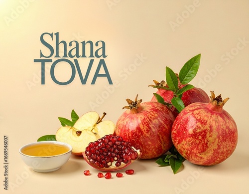 A simple and elegant digital greeting card for Rosh Hashanah. Shana Tova phrase decorated by honey, apple, and pomegranates.