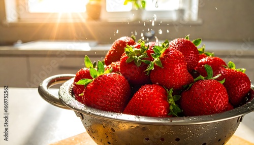Fresh, bright red strawberries in a colander, being washed with water in a sunny kitchen.