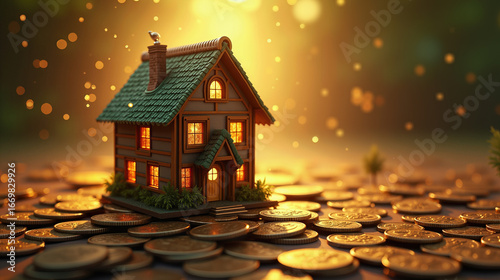 Tiny coins magically transforming into detailed matchbox house with garden in golden lighting - the concept of saving for big purchases.