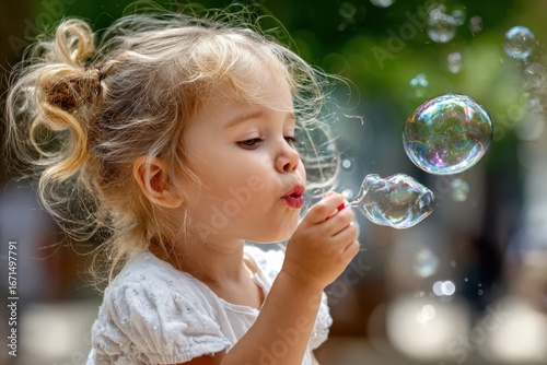 Little Girl Blowing Bubbles in a Sunny Park, Childhood Fun and Joy
