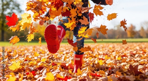 Joyful child in red boots kicking up autumn leaves.