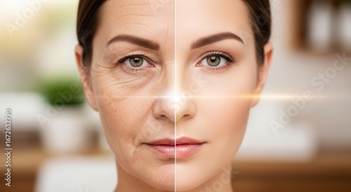 Beautiful woman's face, half before and half after laser skin rejuvenation. Wrinkles and spots disappear, revealing smooth, radiant skin. Aesthetic medicine and anti-aging.