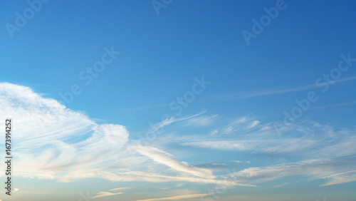 Feathery cirrus clouds stretch across a clear morning sky