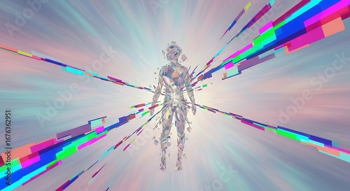 A fragmented digital human figure disintegrates into colorful, pixelated data streams against a radiant, abstract background.