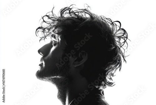 Silhouette of a person with curly hair and an expressive profile against a plain white background